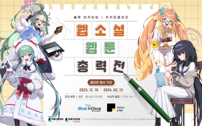 ... 넥슨은 더 많은 이용자들이 수상작을 접할 수 있도록 향후 모든 수상작을 모은 작품집을 출간할 계획이다. 공모전 접수는 12월 19일부터 2024년 2월 13일까지 진행된다. 웹소설 부문은 카카오페이지에서, 웹툰 부문은 ‘블루 아카이브’ 공식 커뮤니티