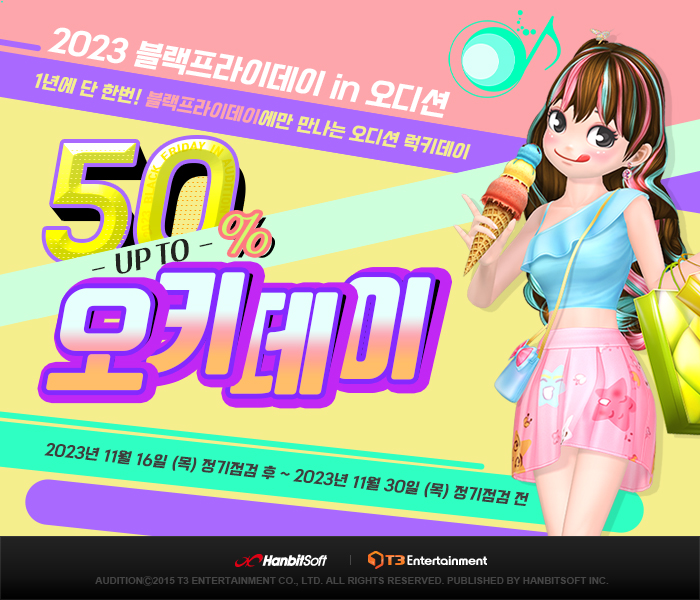 ...11월16일점검후부터11월23일점검전까지상의·하의·신발류아바타에대해,11월23일점검후부터11월30일점검전까지헤어·페이스·세트류아바타에대해할인이적용된다. 이와함께오디션은11월16일점검을통해30레벨이하유저들의개인연습을지원하는신규