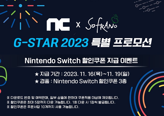 ... 또한 부스 내 이벤트 존에서 진행되는 간단한 미션들을 수행하면 Nintendo Switch OLED 모델을 포함한 다양한 경품을 얻을 수 있는 이벤트에도 참여할 수 있다. 상기 특별 프로모션에 관한 자세한 내용은 공식 팝업페이지에서도 확인할 수 있다. 게임피아㈜는 엔씨소