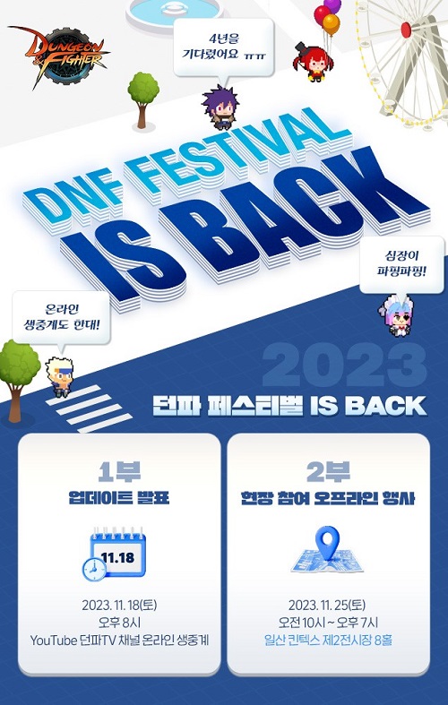 ... 성승헌 캐스터가 진행을 맡으며, ‘던파’ 개발을 총괄하는 네오플 이원만 디렉터와 김윤희 콘텐츠 디렉터가 무대에 올라 겨울 업데이트 계획과 세부 콘텐츠를 발표한다. 11월 25일 일산 킨텍스 제2전시장 8홀에서 개최하는 2부는 개발진과 이용자가 교류하고