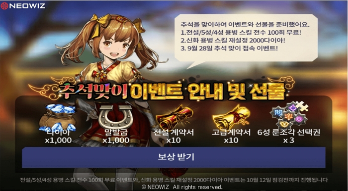 ... 같은 기간, 신화 용병의 스킬을 재설정할 수 있는 다이아의 비용도 할인된다. 또, 오는 28일부터 10월 10일까지는 접속 보상으로 ‘전설 스킬북’, ‘5성 용병 선택권’, ‘전설 조력자 도전권’ 등 고급 보상을
