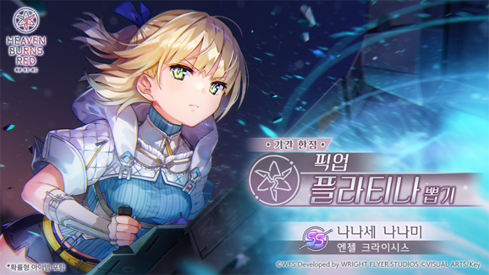 ... 나나세 나나미 재등장기념 로그인 보너스로, 기간 중 첫 로그인 한정으로 플라티나 뽑기 10연속 티켓을 획득할 수 있다. 획득한 플라티나 뽑기 10연속 티켓은 기간 한정 SS <레저넌스> [엔젤 크라이시스] 나나세 나나미가 픽업된 '기간 한정 픽업