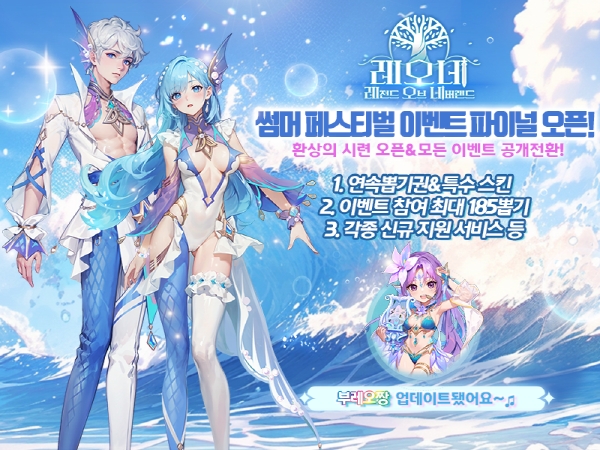 ... 금일 업데이트된 ‘부레오짱’은 강력한 딜링형 물속성 꽃의 정령으로 강력함과 아름다움을 겸비한 신규 정령이다. 이와 함께 ‘썸머 페스티벌’ 특별 상품을 오픈하고, 시원한 막바지 여름을 선물하기 위해 기존 ‘썸머 페스티벌&