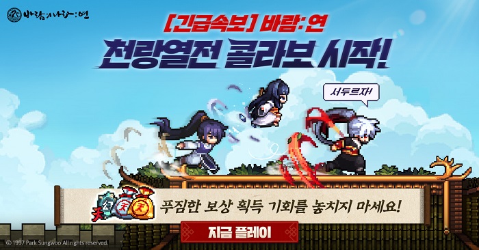 ... 주인공 ‘연오랑’은 원작 스토리에 맞춰 각성 전과 후, 2가지 버전으로 등장한다. 9월 21일까지 ‘천랑열전’ 만화 속 명장면들을 ‘바람의나라: 연’만의 방식으로 재해석한 컬래버레이션 이벤트도 진행한다. 이