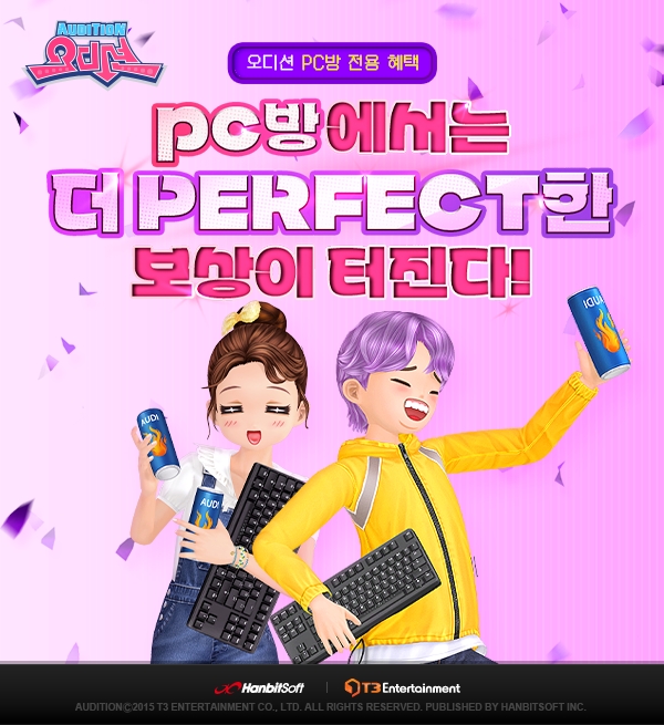 ... 이벤트 기간 중 가맹 PC방에서 오디션을 즐기면 경험치와 덴을 330% 추가 획득한다. 또한 PC방 유저가 방장인 게임룸에서 플레이하는 유저 모두 10%의 경험치 및 덴 보너스를 얻는다. 아울러 커플가든에서 5단계 꽃 수확 시 기존 30 커플포인트에서 40포인트로 커플포
