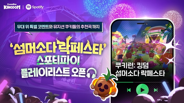 ... 플레이리스트의 첫 번째 파트 ‘페스티벌 라이브’는 쿠키런: 킹덤의 쿠키 4종이 가상의 락 콘서트에서 선보이는 신곡 음원을 담았다. 플레이리스트는 ▲파르페맛 쿠키의 ‘Sweet Serenade’(성우 박지윤) ▲블랙레모네이드맛 쿠키