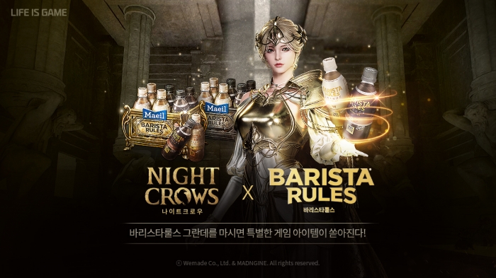 ... 모든 상품에는 <나이트 크로우>에서 사용 가능한 ‘바리스타룰스 상자’ 쿠폰이 들어있다. 바리스타룰스 상자는 계정당 횟수 제한 없이 사용 가능하다. 바리스타룰스 상자를 열면 빠른 성장을 돕는 ‘돌격의 영약’, &l