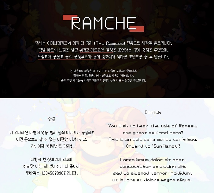 ... ‘더 램지’를 비롯해 다양한 인디 게임과 레트로 플랫포머 게임을 개발해 온 박상훈 디렉터는 ‘레트로 풍의 폰트, 특히 한글 폰트는 구하기가 어렵다. 램체는 레트로 한글 폰트를 애타게 찾는 많은 분들을 위한 선물이 될 것이라 생각한다. &rs