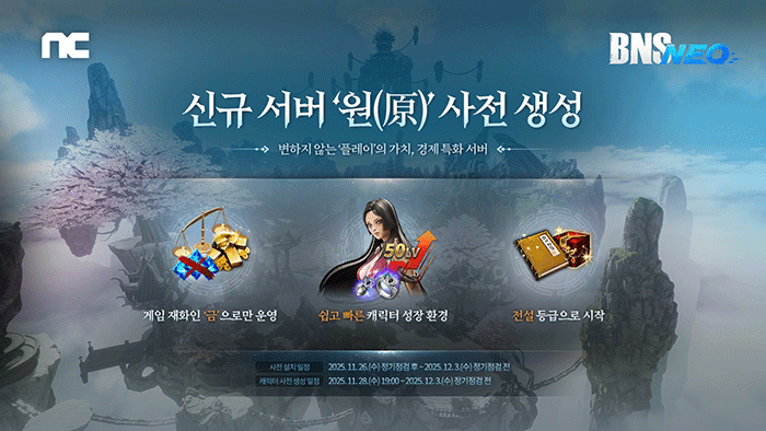 ... 기존 서버보다 던전 플레이와 몬스터 사냥을 통한 경험치 획득이 수월해 신규 이용자들의 빠른 성장이 가능하다. 엔씨(NC)는 오는 12월 3일 19시에 원 서버를 오픈한다. 캐릭터 생성 시 ‘고속 성장’을 통해 50레벨로 시작할 수 있으며, 신규 외전