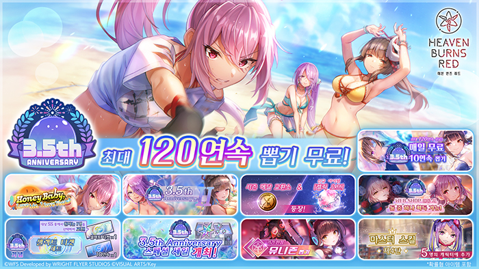 ... 이와 더불어 수영복 의상의 키류/쿠라가 등장하는 '3. 5th Anniversary 뽑기 Ⅱ'도 개최한다. 또한 기간 한정 유니즌 스타일 아사쿠라 카렌의 등장도 확정됐다