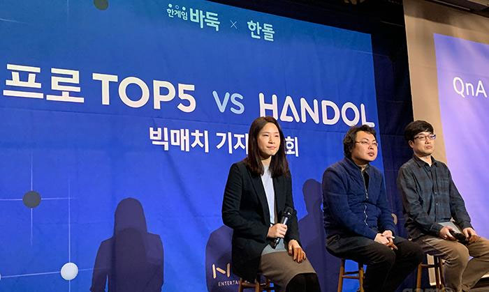 ...0버전으로 발전된 인공지능이다. 이를 바탕으로 지난 12월부터 국내 바둑 프로 기사와의 대국을 진행한 ‘한돌’은 다른 프로 기사들을 꺾고 마지막 신진서 9단과의 대국을 진행한다. 박근한 NHN엔터테인먼트 기술연구센터 이사, 이창율 게임AI팀 팀장, 송은영 GB기획팀 팀장은 질의응