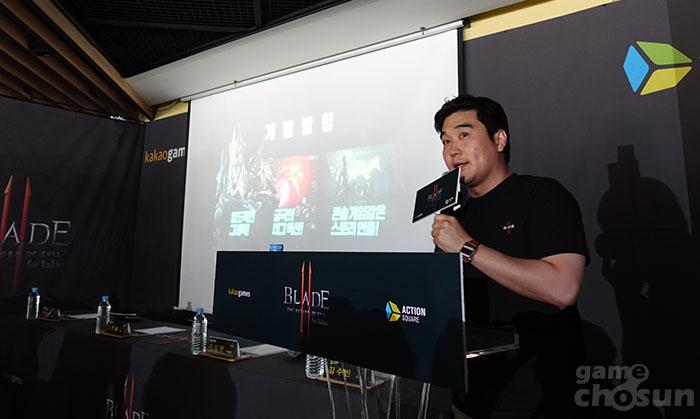 ...(왼쪽부터)지승헌 카카오게임즈 사업실장, 액션스퀘어의 신현승 PD, 이도현 기획팀장, 김수빈 AD = 게임조선 촬영2014년 액션 RPG 돌풍을 일으킨 전작의 명성 때문일까? 출시 일정이 1주일 남짓 남은 만큼 액션스퀘어 개발진도, 카카오게임즈도 '블레이드2'에 거는 기대감과 책임