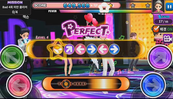 ... 이용자는 떨어지는 노트를 터치하며 리듬게임처럼 즐기면 된다. 하지만 노트는 캐릭터의 능력치에 영향을 미치기 때문에 스테이지를 클리어하기 위해서는 최대한 많이 눌러야 한다. 반대로 자신의 캐릭터가 좋다면 약간의 실수도 용납할 수 있다