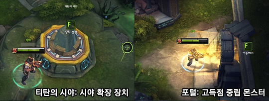 ... 티탄의 유적은 강력한 유닛 티탄과 플레이어가 함께 싸우는 넓은 전장으로 제한 시간 25분이 주어지며 적 본진에 있는 티탄의 핵을 먼저 파괴하거나 1,000점에 먼저 도달한 팀이 승리한다. 플레이어는 본진에서 생성되는 수호병과 티탄을 이용해 상대 본진을 공략하고 한편으로 전장