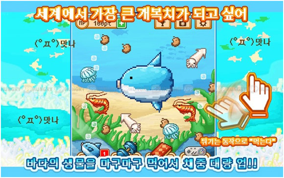 ... ▲ 최근 아이디어로 승부하는 게임들이 호평 받는 중 게임방식은 화면에 있는 먹잇감을 터치하면 개복치가 먹이를 먹고 화면 상단에 게이지를 모두 채우면 개복치가 성장하게 된다. 단 개복치는 민감하기 때문에 특정 음식만 편식 시키거나 조금만 관리를 잘 못 해줘도 돌연사를 하니 꽤