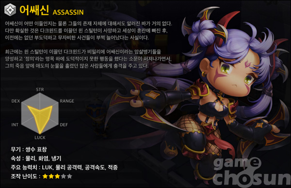 ... ◆ 성인 여성의 매력을 한껏! 처음 애스커의 생성창에 서 있는 캐릭터들을 보면 단연 어쌔신에 눈이 갈 수 밖에 없다. 훌륭한 성인 여성의 모습을 한 어새신의 외모는 남성 캐릭터인 검투사, 유아 체형의 배틀 메이지에 비해 더욱 매력적이기 때문이다. 물론 배틀 메이지의