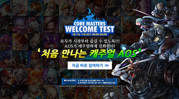 ... ▲ 코어마스터즈가 지난 15일 웰컴 테스트를 마쳤다. 코어마스터즈는 4대4로 대전하는 AOS 게임이다. 몬스터를 처치하여 얻은 코어는 서로 상대 팀 캐릭터를 처치하여 뺏을 수 있다