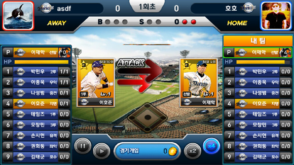 ... 경기 중간 등장하는 각 상황 별 애니메이션과 유니폼의 디테일이나, 이닝 교체 시 선수들의 모션은 경기에 대한 몰입도를 높여 준다. KBO 소속 아홉 개 팀 중 한 팀을 선택할 수 있으며, 세트덱 속성을 결정, 경기에 출전할 선발 및 후보를 선택할 수 있다. 또한, 포지션 변