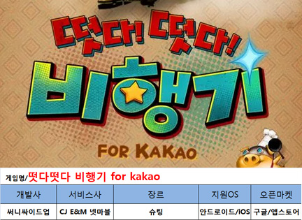 ...co. kr) 등에 기초하고 있습니다. <편집자주> '떳다떳다비행기 for Kakao'는 엽기 발랄 개성 넘치는 캐릭터들을 활용해 간단한 조작으로 플레이할 수 있는 슈팅게임으로친구들과 누가 더 오래, 더 멀리 가는지 점수 경쟁을 펼치게 된다