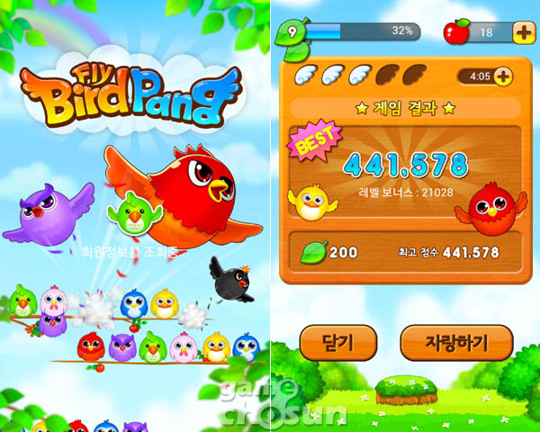 ...결국 게임이 추구하는 재미의 본질은 콤보나 피버모드를 활용해 카카오톡 친구들과 점수 및 순위 경쟁을 펼치는 것. ◆ 버드팡 = 새가 나오는 퍼즐은 아니겠지?버드팡이라고 새가 나오는 퍼즐이라고 생각하면 오산이 아니라 정답이다. 버드팡은 그 이름에 걸맞게 버블 대신 새가 등장하는 퍼즐
