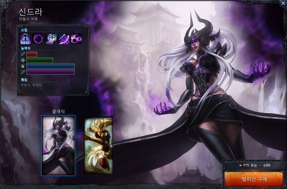 ... 우선 신드라는 자신의 주변을 회전하는 3개의 구체와 미니언을 이용해 상대에게 피해를 주는 독특한 챔피언이다. 구체를 무기로 사용하는 점은 시계태엽 소녀 '오리아나'와 같지만 엄밀히 말하면 두 챔피언은 다르다. 오리아나의 ‘명령:공격’(Q스킬)은 구체를 목표지점으로 이동시키