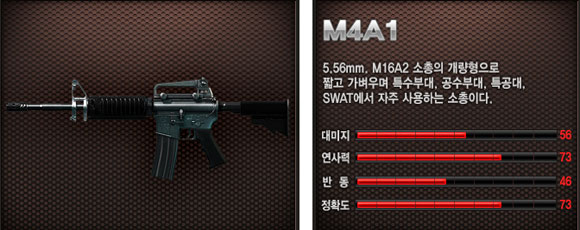 ... 스페셜포스2 게임조선에서는 라이플, 머신건(MG), 서브머신건(SMG)의 부위별 데미지를 실험했다. 부위별 데미지를 알아보기 전에 M4A1에 대하여 알아보자. ▶ M4A1 M4A1은 '스페셜포스2'에서 데미지 56으로 AK103보다는 14나 낮다