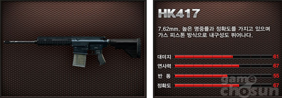 ... 부위별 데미지를 알아보기 전에 Ak103, M4A1에 이어서 HK417에 대하여 알아보자. ▶ HK417 HK417은 '스페셜포스2'에서 데미지가 61로 모든 성능이 AK103과 M4A1의 중간에 있는 총이다. 이 총은 조준사격의 성능이 좋은 편이고 데미지도 M4A1