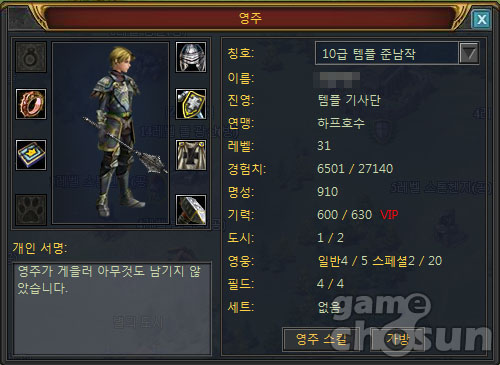 ... 영주(플레이어)의 레벨이 30레벨가 되거나 캐릭터 생성 후 8일째 되는 날 이 초보자 보호 기간이 자동으로 풀리게 됐고, 이전까지는 도시를 발전시키고 주변에 나타난 적대NPC를 잡으며 영주와 영웅을 키우는 평이한 게임으로 알았지만, 갑작스레 하루아침에 내 도시가 점령당하고 세금
