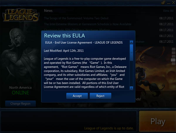 ... 오늘 리뷰 할 리그 오브 레전드(이하 LOL)가 바로 본래 제작자들이 Dota를 더욱 업그레이드하여 온라인용으로 만든 게임이다. ▲로그인 화면. LOL은 상대편 기지를 파괴하는 것이 목표인 AoS(Aeon of Strifes)장르의 게임인데, 이미 미국, 중국, 유럽에서