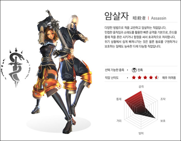 ... 또한, 신규직업으로 암살자가 추가됐습니다. 새로 추가된 암살자는 진족만 선택이 가능하며, 소태도(짧은 검)을 착용하고 공격력과 방어력이 극과극을 이루며 은신, 잠행, 함정 등을 사용하는 이름 그대로 암살자의 특색이 잘 드러납니다. 그외 블레이드앤소울의 히스토리를 담은