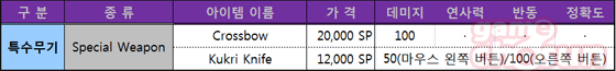 ... 이 무기가이드는 주무기, 보조무기, 특수무기/투척무기 등 총 3편으로 나뉘어 소개된다. <특수무기 / 투척무기 편> 지난 7월 오픈 리허설에서 공개된 FPS게임 '스페셜포스2'의 특수무기는 석궁, 쿠쿠리 나이프등 2종이 있으며, 향후 지속적으로 실존 특수장비들이