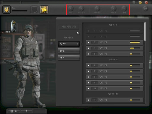 ... 계급, 경험치, 럭키 포인트왼쪽 부터 자신의 계급, 경험치, 닉네임, 럭키 포인트를 확인할 수 있다. 2. 상점, 개인창고, 미니게임, 내정보, 클랜, 채널상점 : 무기와 장비 탭이 있는데 무기탭 에서는 주무기, 보조무기, 특수무기, 투척무기를 구입하거나 비교할 수 있으며