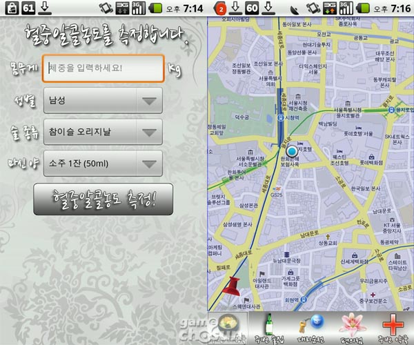... 이앱을 다운로드 받은 후 실행하면 '술 잘먹는 법'과 '술 깨는 법', '음주 측정', '주변 지도', '술술 토크' 등 5개의 항목을 볼 수 있다. * 기자는 안드로이드 OS 기반의스마트폰으로 안드로이드 마켓에서 해당 앱을 구입했다. ▶ 술 잘먹는 법? '말을 많이