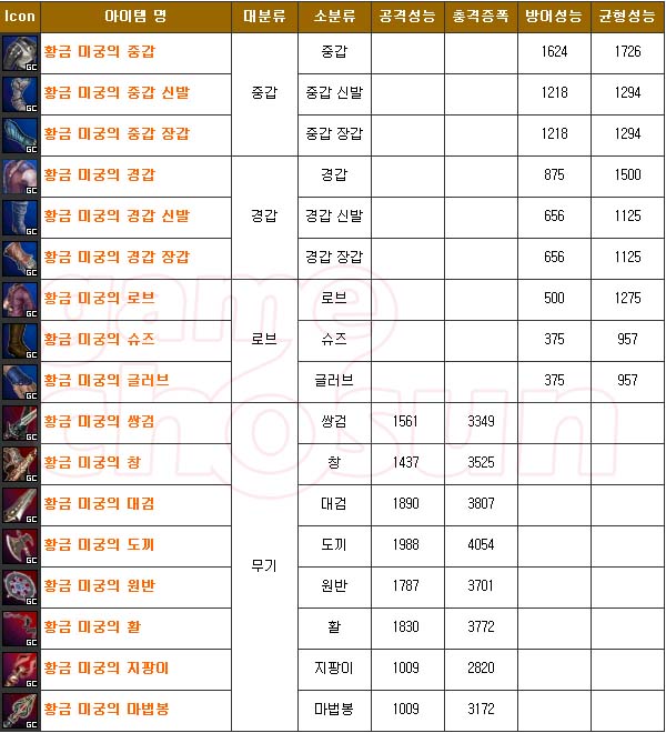 ... 전 보스 몬스터에서 발견되는 '황금 미궁의~시리즈', 4네임드 게르곤이 드랍하는 '게르곤의~시리즈', 최종보스 폭군 바라코스가 드랍하는 '폭군 바라코스의~시리즈'가 있으며, 이중 '폭군 바라코스의~시리즈'만 강화가 가능함을 염두해 두자. 기본 성능은 당연 강화가 불가능한 "황금