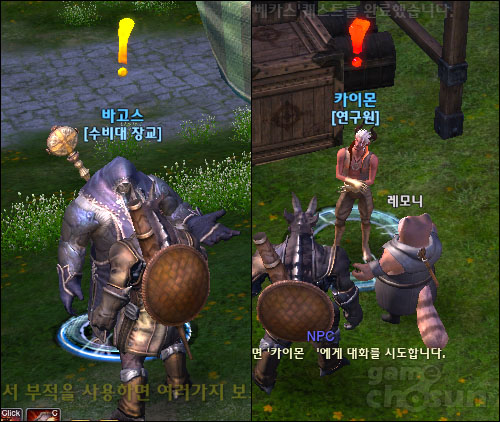 ... ▶ 레벨업의 기본은 퀘스트다 퀘스트를 주는 NPC는 머리 위에 노란색 느낌표를 띄우고 있다. 머리에 노란색 느낌표를 띄우고 있는 NPC는 월드맵 화면과 화면우측에 표시되는 반투명 지도에서도 확인할 수 있다. 퀘스트를 가진 NPC에게 다가가 F키를 눌러서 말을 걸면 받을 수 있