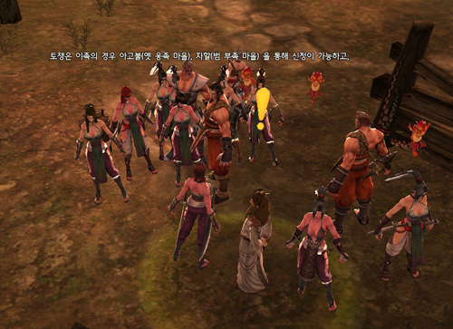 ... 토쟁에 참여하기 위해서는 각 주요 마을의 마을촌장 NPC를 통해 입장 신청을 하고 시간이 되면 입장이 가능하다. 토쟁 입장 시에는 입장가능 인원이 30명으로 정해져 있어 입장부터가 경쟁이다. 입장 시 30명의 토쟁 지원자들이 한곳에 모이며 원형 경기장 형태의 장소에서 전투