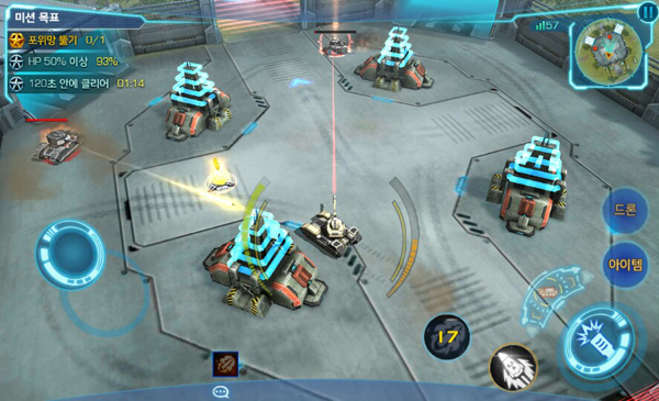 ...캐릭터를 생성하고 게임에 입장하면 튜토리얼에서 조작 방법을 배우게 된다. 좌측 조이스틱으로 이동 조작을 가하고 오른쪽 화면에서는 포탑(포신이 달려 회전하는 부분)을 돌려 시야를 확보한다. 화면을 터치하면 포신에서 공격 경로를 따라 포탄이 날아가게 된다