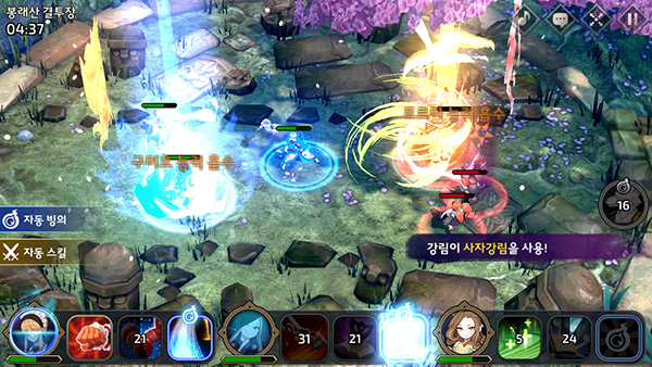 ... 다양한 유형의 영웅은 자신이 선호하는 공격 방식과 팀 조합 갖출 수 있으며, 온라인 못지 않은 속도 전투가 가능하다. 스킬은 궁극기 포함 3개로 구성됐으며 일반 공격과 스펠까지 포함하면 총 7개다. 버튼이 많아 보이지만 실제로 사용하는 스킬은 3~4개 수준이다