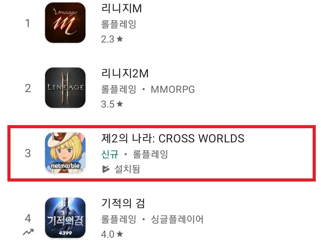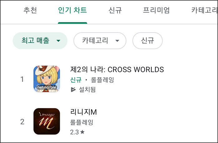 ... 지난 10일 한일 양국에 동시 출시된 제2의 나라는 동화 같은 그래픽과 감미로운 음악으로 게이머들의 이목을 집중시켰고, 출시 당일에는 한일 양대 마켓 인기 순위 1위, 한국 애플 앱스토어 매출 순위 1위를 기록했다. 이어서 출시 이틀 차인 12일에는 구글 플레이스토어매출
