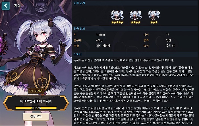 ... 이외에도 특정 영웅 및 전용 무기의 밸런스 조정이 이뤄지는 등의 변경 사항이 있다. 신규 3성 영웅 '네크로맨서 소녀 녹시아'는 이름에서 유추할 수 있듯이 암속성의 지원가형이다. 녹시아는 소환수를 부리는 것이 가장 큰 특징으로, 해당 소환수는 탱커의 역할을