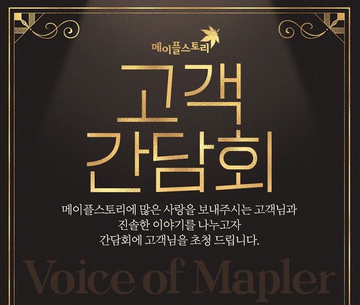 ... 고객 간담회는 4월 11일 오후 2시, 서울 중구에 위치한 한 호텔에서 진행될 예정이며 신청을 통해 접수된 이용자 중 특정 랭킹 기준 7명 및 커뮤니티3명을 선정해 총 10명을 초청한다. 여기서 특정 랭킹 기준은 메이플스토리 공식 홈페이지의 랭킹을 의미하며, 각 '