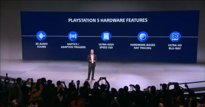 ... 플레이스테이션5의 공식 로고는 지난 기기들의 로고와 마찬가지로 검정 바탕에 흰색으로 플레이스테이션 로고 및 PS5 글자 디자인을 사용했다. 이후 공개된 정보는 플레이스테이션5 하드웨어의 간략한 특징이었다. 플레이스테이션5는 3D 오디오 사운드, 햅틱 적응형 트리거, 초고