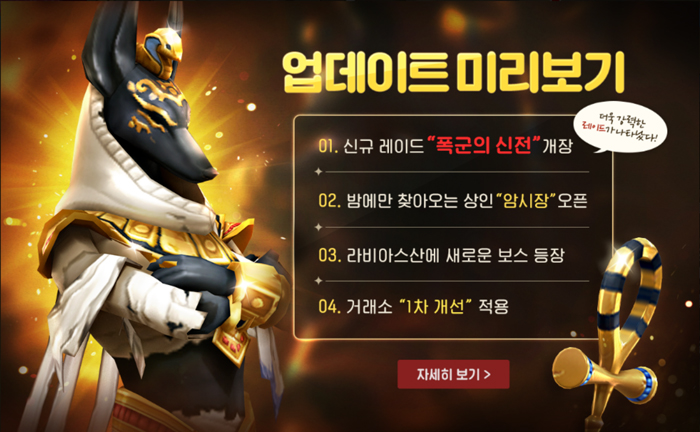 ... 신규 레이드 '폭군의 신전'은 지난 업데이트로 추가된 '잊혀진 왕국의 땅'이나 '세트의 미궁'과 동일한 이집트 콘셉트 레이드로이집트 신화에 등장하는 저승의 신 '아누비스'가 보스로 등장한다. 해당 레이드의 입장 조건