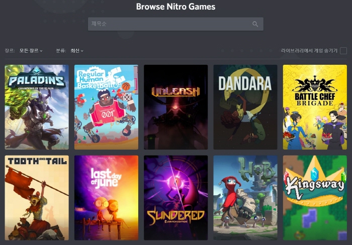 ... 다만 해당 기능은 다른 플랫폼의 동일 서비스와 비교해 게임 가짓수가 적고, 신작 게임 추가가 느리다는 지적이 제기된 바 있다. 니트로 게임 구독 기능으로 제공하는 게임 = 디스코드 니트로 페이지 갈무리 디스코드는 "지난 1년간 대다수의 니트로 가입자가 게