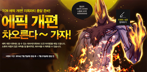 ... 먼저 오는 28일 진행될 개편에 앞서 에픽 아이템 파밍에 도움되는 '에픽 개편 차오른다~가자' 이벤트가 진행된다. 해당 이벤트는 하루에 한 번 게임에 접속할 경우 지옥 파티에 도전할 수 있는 파마석을 3개 지급한다. 또 이벤트 기간 동안 던전 내에서 '생명의 씨앗' 아이템을
