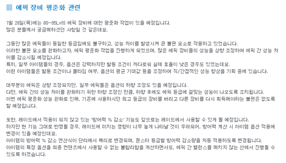 ... 이와 관련해 지난 13일 던전앤파이터의 한 개발자는 공식홈페이지 개발자 노트를 통해 말을 전했다. 해당 글에서 이 개발자는 "많은 에픽들이 동일한 등급임에도 불구하고 성능차이를 보여 큰 불편요소로 작용하고 있어 이번 에픽 평준화 작업을 진행하게 됐다"며 "많은 에픽 장비들의