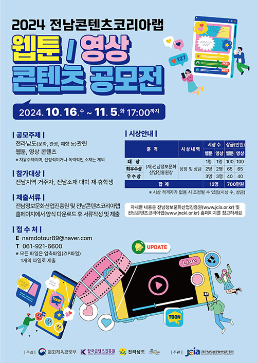... 주제는 자유주제로 제한이 없으나 선정적이거나 폭력적인 소재 또는 이미 제작 지원사업이나 타 공모전에서 지원받은 작품은 선정에서 제외된다. 총 시상금은 700만원 규모로, 전남정보문화산업진흥원장 상장과 함께 △대상(2명, 100만원) △최우수상(4명, 65만원) △우수상(6