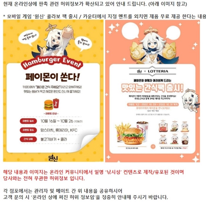 ... 간접 피해를 받은 해당 업체들은 실제로 로스트아크, 카트라이더, 월드 오브 워크래프트, 히어로즈 오브 더 스톰등 국내외 유명 게임 IP와 공식 컬래버레이션을 진행한 바 있어원신의 이용자들이 큰 의심 없이 허위 이벤트 정보에속은것으로 보인다. ▲ 위 이미지는 실제로