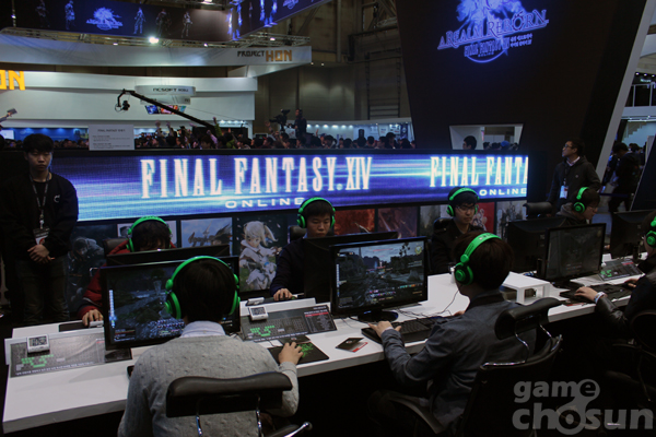 .... . ▲ 심각한 표정으로 파이널판타지14를 보고 있는 한승엽 게임 해설가(좌)와 전용준 캐스터(우) ▲ 파이널판타지14 보스 레이드 시연을 직접 보여준 액토즈소프트 직원들 ▲ 파이널판타지14 행사에 많은 유저들이 몰려들었다