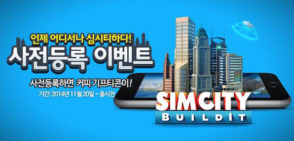 ... EA코리아는 심시티빌드잇 출시를 기념하기 위해 금일부터 정식 출시일 전까지 EA코리아 웹사이트에서 사전등록 이벤트를 실시한다. 사전등록을 한 유저들은 게임이 출시되면 출시 알림 메시지를 받게 되며, 추점을 통해 1000명의 사전등록 신청자에게는 커피 기프티콘을 제공한다.